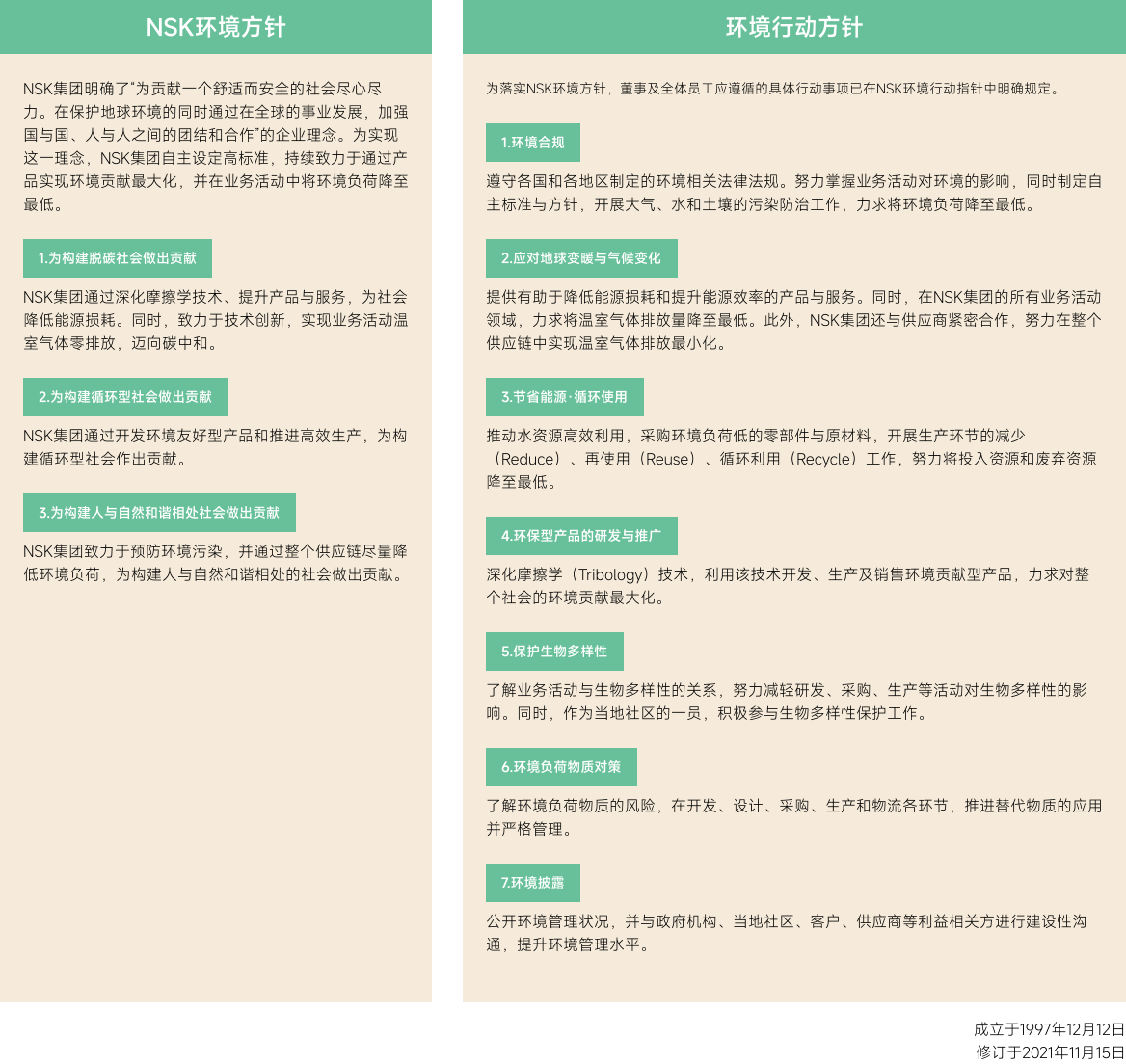 为了将环境活动融入所有业务活动,NSK集团于1997年制定了环境方针和环境行动指南。根据这些方针指南,NSK集团不仅致力于开发有助于降低环境负荷的产品和服务,同时推动面向整个价值链的降低环境负荷的业务运营。 鉴于近年来国际社会对环境的关注日益增加以及对企业环保行动的期待提升,NSK集团于2021年11月对环境方针进行了修订。