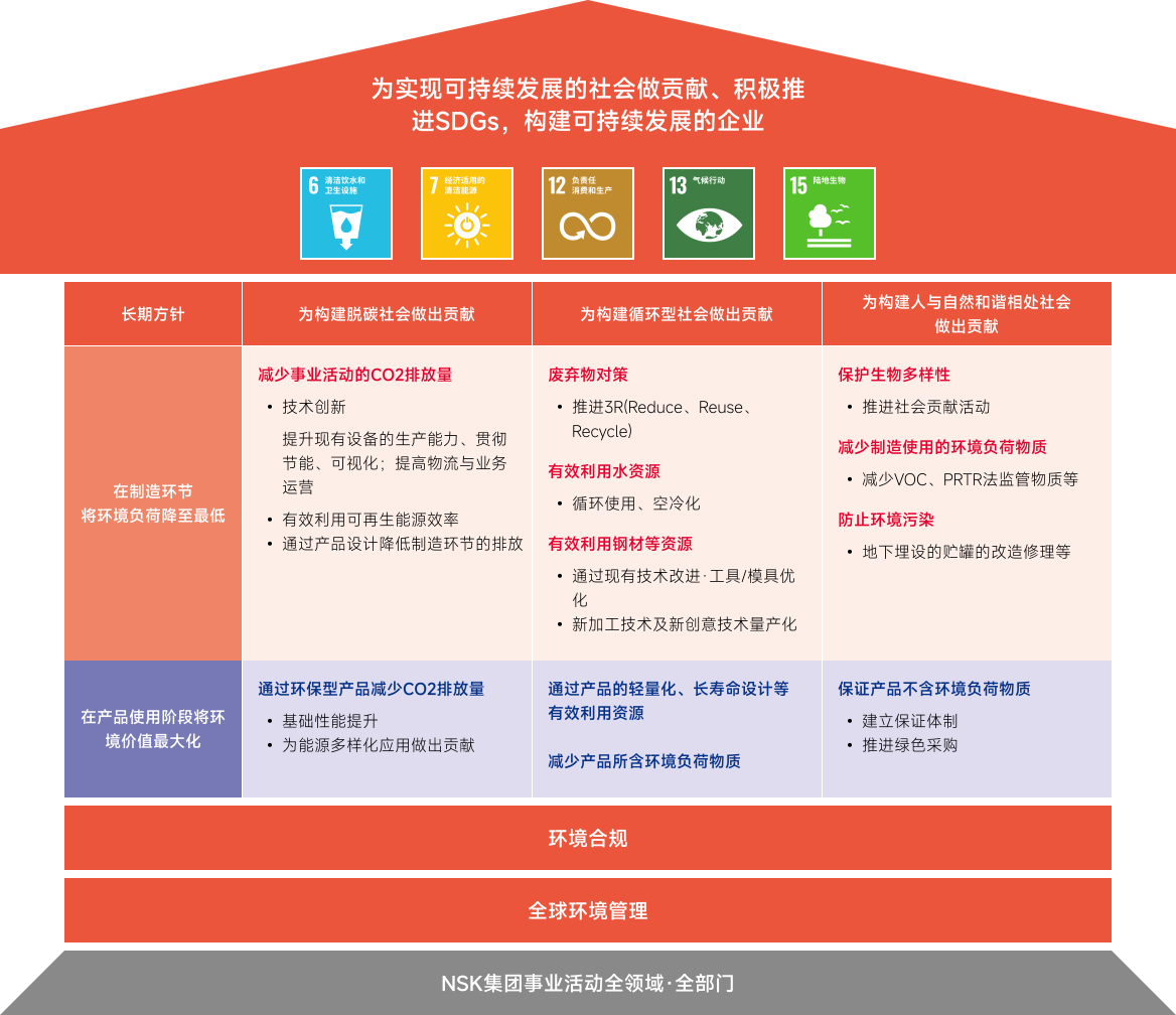为了推进MTP2026中重要课题之一的“ESG经营”,NSK集团制定了环境行动计划。以全球环境管理和环境合规为基础,确立了集团应追求的目标方向——“脱碳社会”“循环型社会”“人与自然共生的社会”。为了实现这些愿景,NSK集团通过自身业务活动对环境的负荷最小化并通过产品对环境的贡献最大化来发挥作用。这一努力也有助于推动实现SDGs目标。