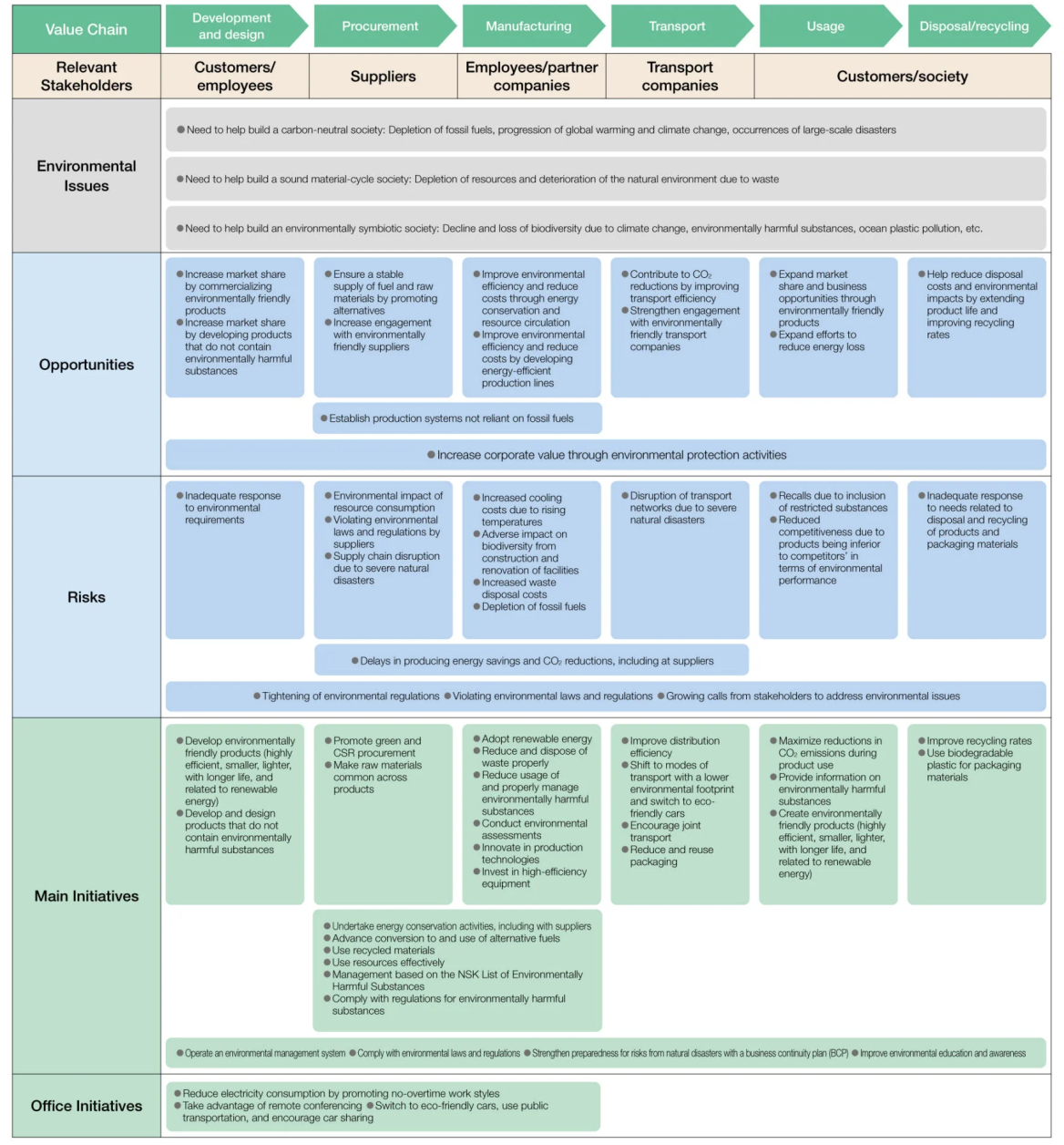 为了实现可持续发展社会,全球范围内正在加快建立相关举措,以推动减少二氧化碳排放、资源循环利用、减少环境负荷物质等,同时各国和地区的法规也在不断强化,企业在汽车电动化等方面的行动也在加速推进。 NSK集团识别并评估价值链各阶段中与环境相关的机遇和风险,并将其纳入经营战略和环境行动计划,以实现持续成长。具体的风险与机遇请参见下图。