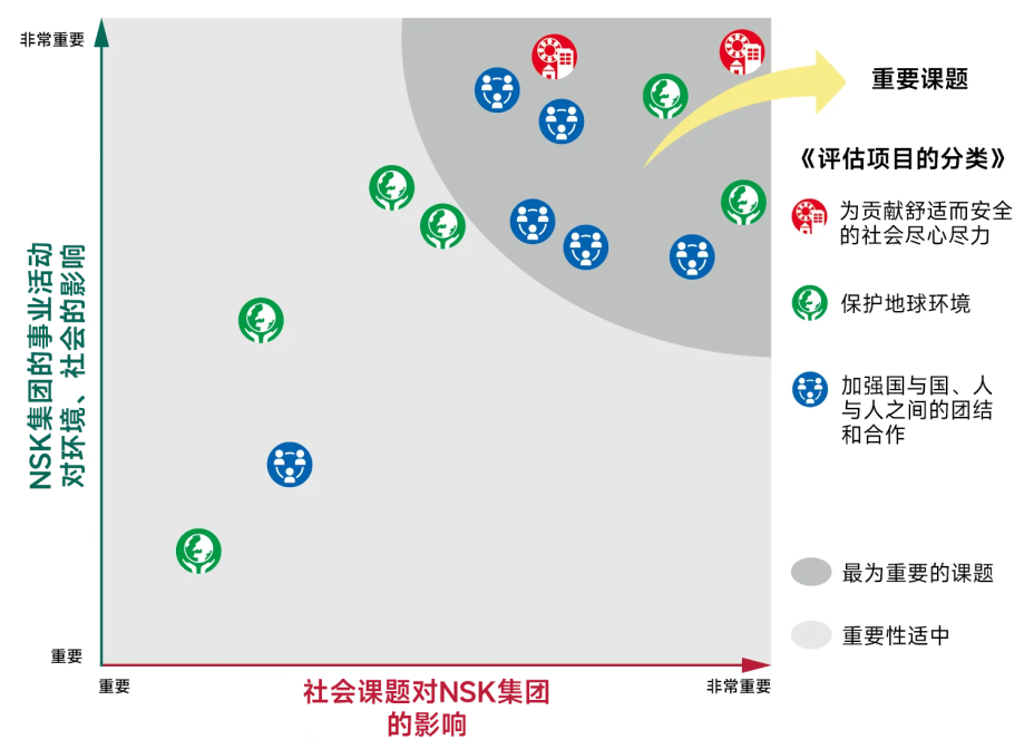 NSK集团将应重点推进的可持续发展领域归纳为“重要课题(Materiality)”,并确定了9项具体内容。基于企业理念,将围绕这些课题开展举措,力求同时实现解决社会课题与实现企业可持续成长。