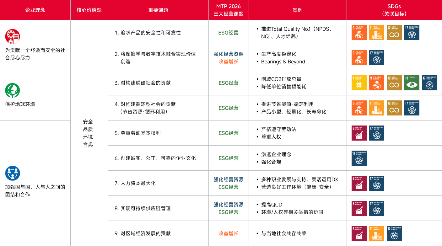 这些纳入评估的课题,与NSK企业理念所明确的“舒适而安全的社会”“保护地球环境”“人与人之间的团结和合作”密切相关,也与作为核心价值的“安全”、“品质”、“环境”、“合规”相一致。同时,这些课题还与NSK的《SDGs宣言》、中期经营计划2026(MTP2026)的重点任务、每年度风险盘点中识别出的课题,以及与客户、供应商等利益相关者合作开展的活动保持一致。