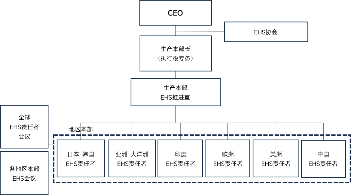NSK集团以CEO为最高负责人,建立了全球安全管理体制。通过该体制开展的各项安全管理活动,由生产本部EHS推进室通过各地区总部,在NSK集团各公司落实推进。 在各地区推进相关课题时,最高决策机构——EHS协商会(由生产本部长、工厂长及事业执行役员参加)每年召开四次会议,决定年度方针并协商课题进展。同时,通过全球EHS责任者会议(各地区EHS责任者参加)与EHS协商会这两个会议机制进行讨论,确保各项课题与措施得到共享和落实。