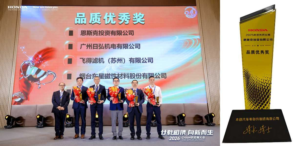 2026年4月9日,本田汽车零部件制造有限公司(以下简称佛山本田零部件)在佛山隆重召开供应商大会。会上,恩斯克投资有限公司(以下简称NSK)凭借二十年如一日的紧密协作与卓越的品质表现,荣获佛山本田零部件颁发的“20周年特别贡献奖”与“品质优秀奖”两项殊荣。NSK中国汽车事业本部首席顾问宮﨑貴史代表NSK上台接受表彰。
