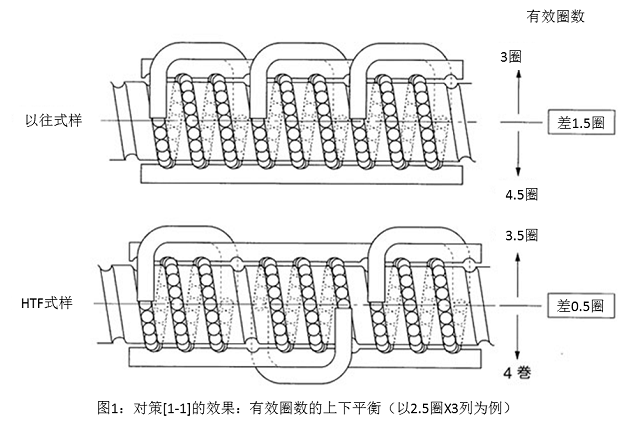 →对策[1-1][1-2]:通过对钢球循环的配列进行最优化设计,螺母内的钢球分布接近对称,由此实现了负载分布均一化。