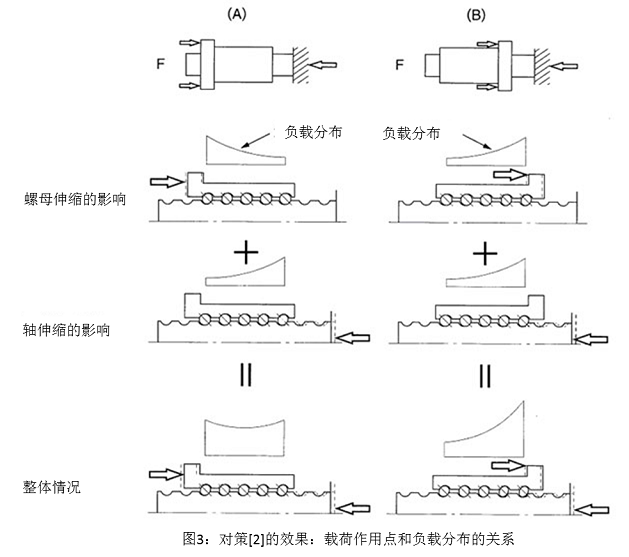 如下图(A)所示,丝杠轴、螺母的负载作用点设置到相反侧,丝杠轴和螺母的轴向伸缩影响就会相互抵消。