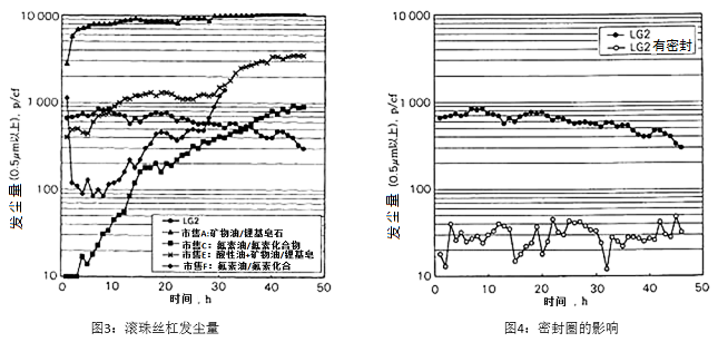 (4)随着环境温度升高、转速增大,润滑脂产尘量会急剧增加。考虑到低产尘性的维持,LG2的使用温度界限为70℃。