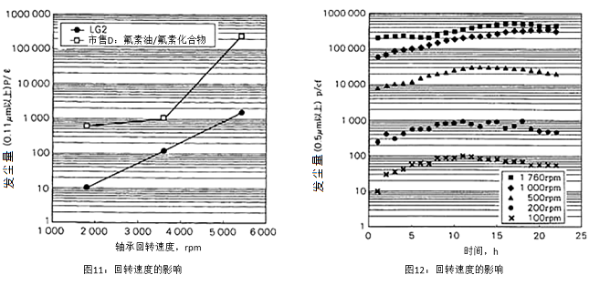 封入LG2润滑脂和氟素系润滑脂D的球轴承695W,分别在1800、3600、5400转条件下运转时的产尘量测试结果如图11所示