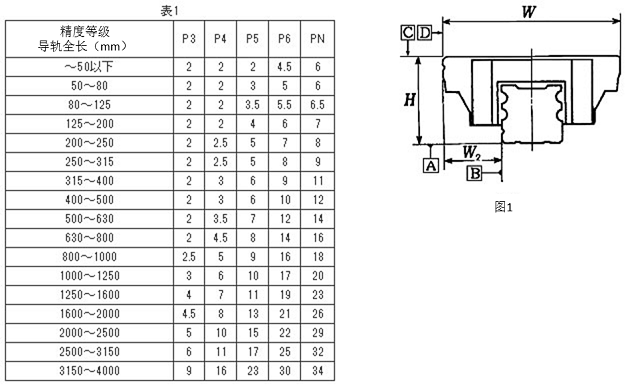 NSK把直线导轨单体的运行精度规定为“运行平行度”。运行平行度是导轨的滑块沿导轨长度方向移动时产生的滑块基准面相对于导轨基准面的变动量。运行平行度的测量位置如图1的H1及W2方向,规格值根据直线导轨的精度等级和导轨的长度决定,如表1所示。
