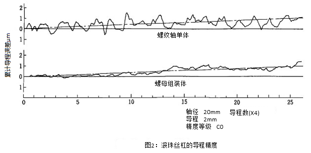 图2是最高精度C0级的导程误差的一个示例。累计代表移动量误差是1μm/208mm,相对丝杠部分有效长度的最大幅度是2μm,螺母组装状态的最大幅度不超过0.9μm,是规格值的1/2以下。