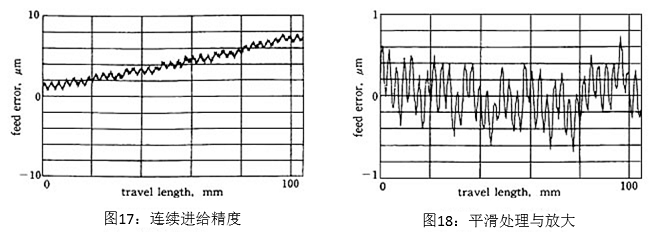 图12展示了NC机械步进进给的结果,产生了20μm的空程。使用同样的机器,不断增大运送速度进行测量,如图13所示,空程量为负(移动过了)。这是因为启动时相对于指令实际的运动有所延迟,因此停止时出现了超程。