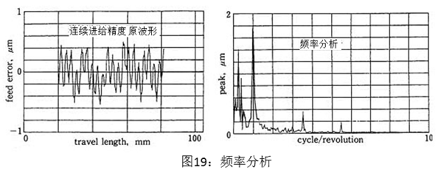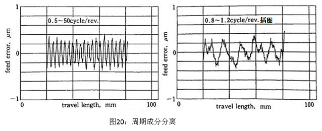 图20为逆转1周且滤掉了周期成分(0.8~1.2cycle/rev.)的结果。出现了高频成分的乱波,周期12mm(0.25cycle/rev.)的成分为0.5~0.6um。这个成分与螺纹磨床的螺纹导程一致,因此认为是由于滚珠丝杠的导程误差引起的。可以根据分析连续进给精度的周期性,分离出各要素的误差,进行评价。
